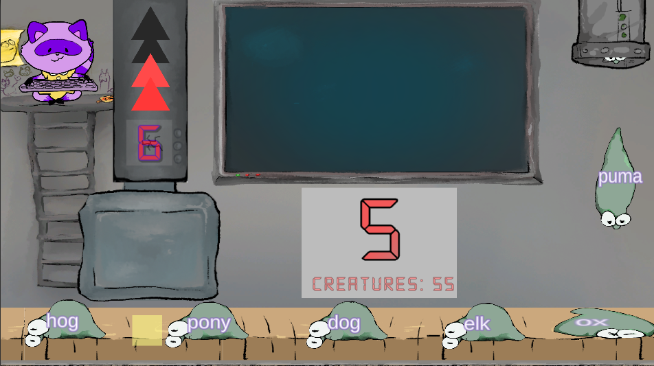 Create as many animals as you can within 90 seconds. The speed of the blobs flowing will increase as the player correctly types and slams more critters. The speed will slow when words are missed or blobs are not pressed entirely.